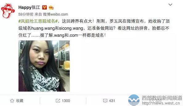 微博知名博主@一起神回复则发文说:罗玉凤收购了sicong.wang域名(.wang和.com是同样级别的域名),听说要卖给王思聪?要是我就送给王思聪,还可以向娱乐圈纪委变相行个贿哈哈哈!