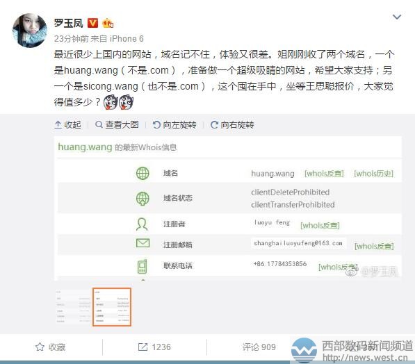 微博晒图,凤姐收购“黄网”、“思聪”域名 凤姐在微博上称,自己收购的单拼域名huang.wang将用来做一个比较吸睛的网站。虽然目前什么网站并未透露,但从域名huang.wang的品相含义上来说,绝对堪称精品。前缀huang有“黄、谎、凰”等含义,组合在一起huang.wang有“黄网、谎网、凰网”之意,适合搭建电商、游戏等网站。 双拼域名sicong.wang对应大家熟知的国民老公“王思聪”,这类域名因为对应名人,指向性很明确,适合搭建个人网站或者粉丝俱乐部平台。凤姐收购这个域名的意图不言而喻,而且也在微博上公开喊话:屯在手中,坐等王思聪收购。 进军新顶级域名,凤姐也玩跨界了? 凤姐,原名罗玉凤,因一系列雷人言论在网络上走红,被人称为“凤姐”,算是网红界的鼻祖了。此前,凤姐曾宣称要进军自媒体,还因一篇《我是罗玉凤》的微信文章刷爆朋友圈。现在,凤姐突然又要进军域名圈了吗? 凤姐在微博上称,自己很少上国内的网站,因为域名记不住,体验又差。看起来,凤姐这回收购新顶级域名是看准了目前像huang.wang这样的拼音域名在国内有着记忆上的优势。虽然还是域名圈的新人,但不得不说凤姐选新顶级域名的眼光颇为独到,不管是huang.wang还是sicong.wang都是极有分量的域名,一个有突出的建站应用优势,一个有着名人效应,凤姐这跨界的第一步走得还不错。 建“黄网”喊话“王思聪”!大V们也不淡定 凤姐微博晒图后,大V们都沸腾了。有人说凤姐要用huang.wang搭建成人网站“黄网”,也有人说凤姐要建的是“凰网”,与“凤”字组合“凤凰”,但与“思聪”组合又是什么意思呢?对此,各路大V们众说纷纭,看呆了我等吃瓜群众。 知名搞笑幽默博主@Happy张江发文说:这回跨界有点大!刚刚,罗玉凤在微博宣布,她收购了顶级域名huang.wang和sicong.wang,还准备做网站?看这网址的拼音,脸都忍不住红了……据了解.wang和.com一样都是域名!