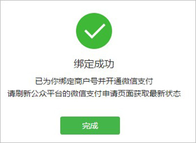 目前仅支持绑定主体一致且完成所有开户流程的新接口普通类型商户号,其他类型均不支持,详情如下: 1)商户号与appid的认证主体不一致; 2)商户号未走完所有开户流程,包括未验证身份、未签署协议等情况; 3)商户号是老tenpay接口的商户号,未完成新接口升级; 4)商户号是境外类型商户号; 5)商户号是服务商类型商户号; 6)商户号因违规处罚导致的限制; 另外,选择该种方式请确认你的业务模式和经营范围是否与“绑定的商户号”一致。如不一致,请走新申请流程获取新的商户号。 3、验证成功后,将会进入绑定成功页;你可通过该商户号进行微信支付的开发,通过该商户号进行收款。看到绑定成功提示后,你的微信支付功能已成功开通,请刷新公众平台的微信支付申请页获取最新状态。如下图所示: