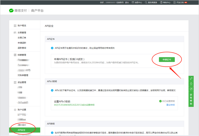 2.3 获取API证书注意:请务必按照操作流程去下载证书,期间请不要关闭工具等相关程序,如生成了证书关闭工具的话,会导致证书无法下载,只能等48小时之后重新生成。(证书一年只能生成3次,下载后请保存好) 一、如何判定证书类型为【权威CA颁发的API证书】登录微信支付商户平台点击APT安全,出现如下图所示则为权威CA颁发的API证书