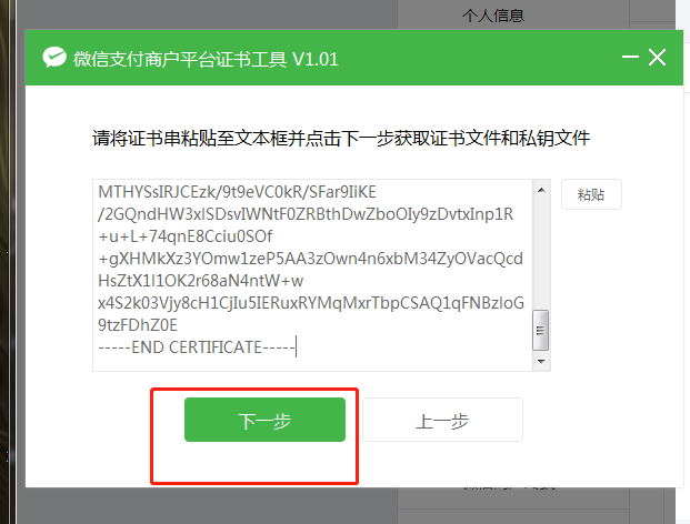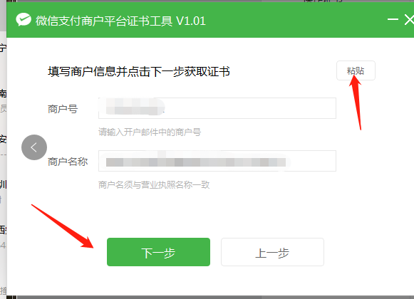 4、复制好商户号和商户名称点击切换至【证书工具】,点击右上角的【粘帖】按钮,将先前复制的商户号和商户名称粘帖到证书工具中,然后点击【下一步】