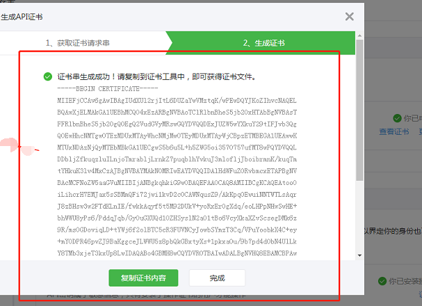 7、点击下一步后会生成证书串【此时系统将认为申请证书成功】点击【复制证书内容】
