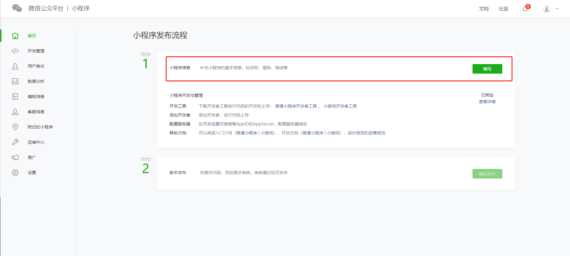 2.完善小程序信息注册小程序后,登录小程序后台首页,点击【填写】完善小程序信息,如名称、图标、描述等;