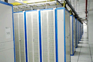 UPS系统,一期共安装四台索科曼(800KVA)系列UPS主机,单台功率为200KVA,总有功率为640KVA。二用二备并机的情况下, 托管满3500台服务器,两路市电同时掉电,油机启动前电池组能工作一小时。二期总功率将更大。单台功率为800KVA。